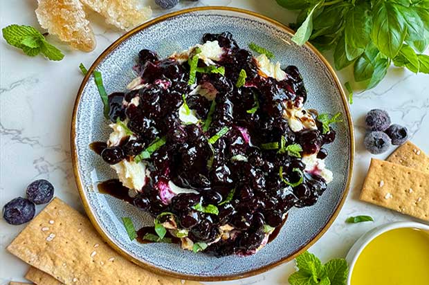 - Spoon the Balsamic Oregon Blueberries over the whipped feta, drizzle with additional balsamic glaze (optional) and top with fresh basil or mint.
