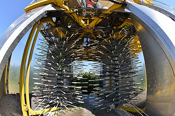 Let’s first understand why berry quality is reduced during machine harvesting. The culprit is the excessive internal bruising damage (IBD) in fruit created by mechanical harvesters. The process goes like this: Berries on the bush enter the body of the OTR harvester and are met by rapidly moving shaking rods to vibrate canes in an up/down or circular motion. The cane movement causes mature berries to detach and fall to a catching surface of OTR harvesters and then intoa conveyor collection system. The fruits are transported onto the transfer belt which brings fruits to the top of the OTR harvester. After fruits go through a trash blower, they drop onto a conveyor belt moving towards the collection flats. Although this sounds like a straightforward process, there are many moving parts that create physical impact forces damaging fruits. Using a Blueberry Impact Recording Device (BIRD) developed by Dr. Li of the University of Georgia, these impact points were very well defined with the polycarbonate catch plates of the OTR machine and accounted for more than 30 percent of total mechanical damage. The magnitude of this impact was extremely high on the catch plates to cause the most significant IBD in fruits. An obvious solution is to modify the hard catch surface in the OTR harvester with softer surfaces. The design of a soft surface can be achieved by either incorporating netted material or suspending “rubber” sheets without hard surfaces under the material for catching the fruit (Takeda and Wolford, US Patent No. 9,750,188). The challenges are that the soft materials must meet food safety standards as well as the durability to be used in the field. The currently available soft catch system on the market is OXBO’s SOFTSurface® kit.