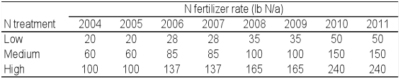 There has been no significant effect of N fertilization rate on cumulative yield to date – the sum of machine-harvested yield in years 2006-2011 (Fig. 1).