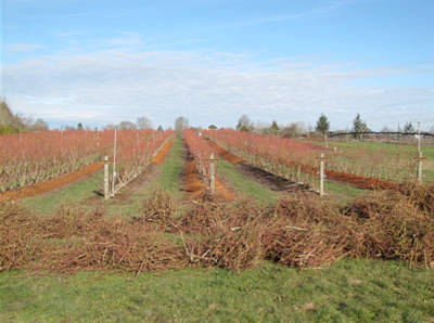 We have been studying the following treatments in a planting of “Elliott” established at Oregon State University’s North Willamette Research and Extension Center (NWREC) in October 2003, with or without pre-plant incorporation of sawdust (ten units/acre); with or without a surface sawdust mulch (three inches deep over raised beds); and low, medium or high rate of N fertilization. Nitrogen fertilizer was applied as a granular product (ammonium sulfate in 2004-05; and urea subsequently) as a triple split. The total rate was applied per acre but was concentrated in the row as a broadcast band. The rates used depended on planting age:
